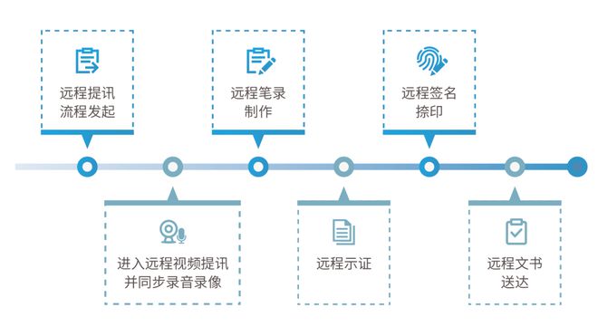 远程提讯使用流程:远程提讯流程发起 > 进入远程视频提讯并同步录音录像 > 远程笔录制作 > 远程示证—远程签名捺印—远程文书送达。