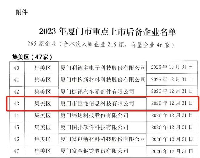 为贯彻落实《厦门市人民政府关于印发进一步推进企业上市提高上市公司质量若干措施的通知》 (厦府规[2021]11号)文件精神,加快推进厦门市企业上市工作,加强企业后备资源的培育力度,近日,厦门市上市办经筛选审核公示,对名单予以公布,巨龙信息成功入选《2023年厦门市重点上市后备企业名单》。