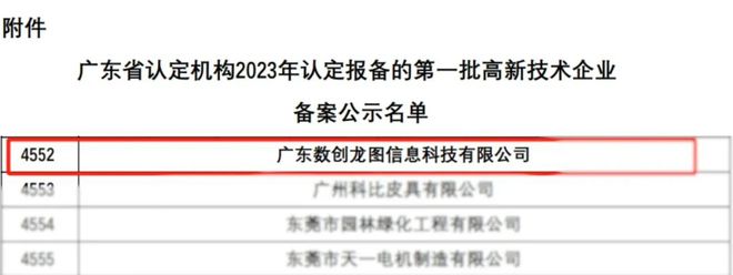 近日,全国高新技术企业认定管理工作领导小组办公室发布广东省认定机构2023年认定报备的第一批高新技术企业,广东数创龙图信息科技有限公司被认定为“国家高新技术企业”。