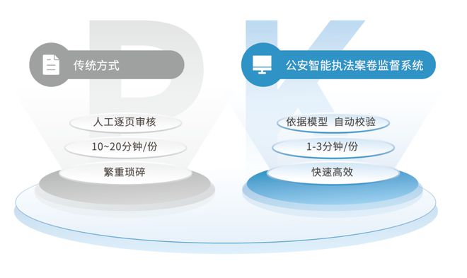 传统案卷文书多使用纸质文书,执法人员逐页审核完一份文书需要10-20分钟。公安智能执法案卷监督系统采用卷宗自动校验方式,依据校验模型可以在1-3分钟完成一份文书的自动校验工作,辅于人工审核,极大提高法制民警工作效率。