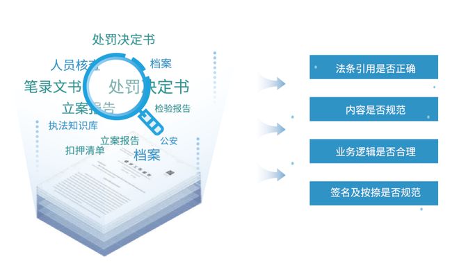 法度智能执法案卷监督系统采用OCR识别及NLP技术将案卷文书电子化、结构化,再基于法度专家知识库的文书校验模型进行分析,实现刑事/行政案件文书的程序监督和实体监督校验,检测发现案卷文书不规范的瑕疵、缺漏、错误、风险点等,进一步规范办案文书要求,达到程序合法、适用依据正确、定性准确、处罚适当,确保执法工作的规范性和严谨性。