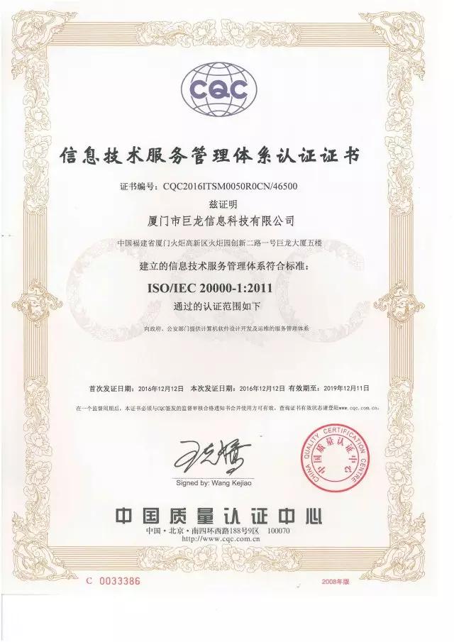 巨龙信息顺利通过ISO20000信息技术服务管理体系认证