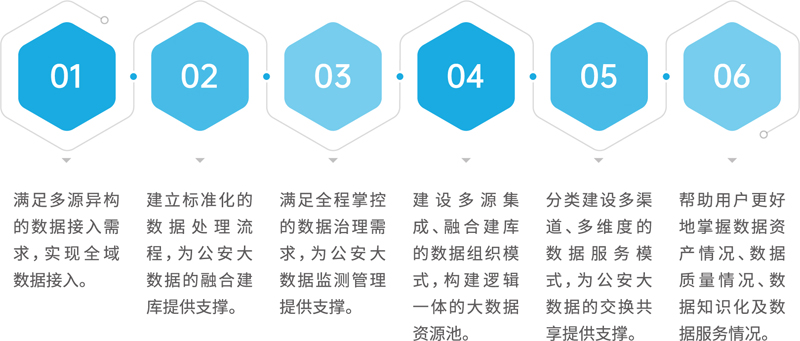 大数据治理工程以“六个统一”为目标,落地“四化”原则,遵循《公安大数据处理技术要求》,具备数据接入 数据处理、数据治理、数据组织、数据服务五大能力,通过对数据资源的智能处理和规范组织,形成数据增值和数据抽象能力;通过建立集数据标识、数据分析、数据挖掘为一体的计算引擎,形成跨部门、跨系统、跨业务的智能 数据服务能力;通过对数据全生命周期的精细化治理,形成“总关联、总索引、总导航”的数据资产化管理能力。