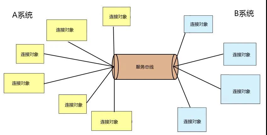 随着技术的发展,在服务数据共享上,采用总线连接方式取代点对点的连接方式,具体是将多对多的连接方式变成一对一的方式,所有连接方均与总线连接,然后通过总线再连接到需要连接的对方。