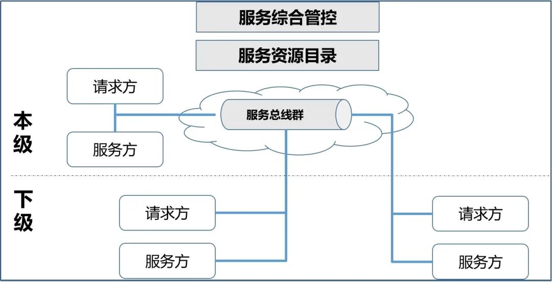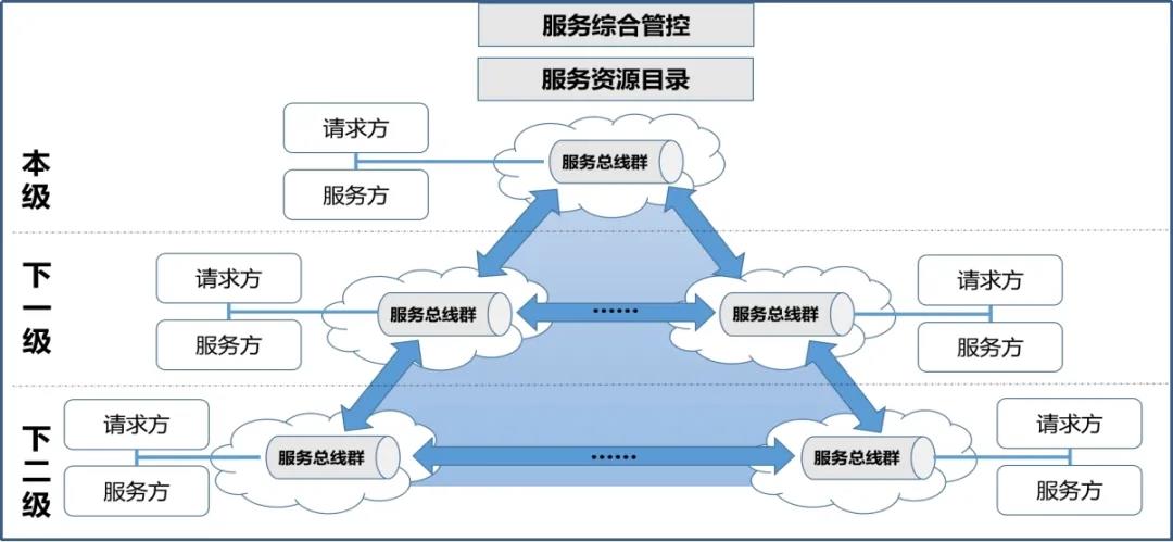 ■服务总线在建设单位和下属需要独立运行的单位分别部署,且各单位接入的服务方、请求方也都挂接在本单位专属的服务总线上,服务总线之间相互通信,形成一个完整的服务API网络。