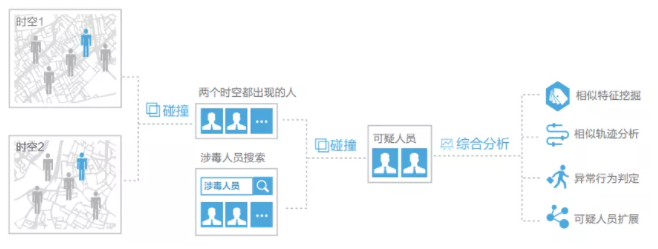 基于对象库及关系库,将旅馆住宿数据、卡口过车数据、WIFI数据、铁路购票数据、航空乘机数据等数据各类轨迹数据统一映射到人,最终形成产生这些轨迹数据的人群集合。