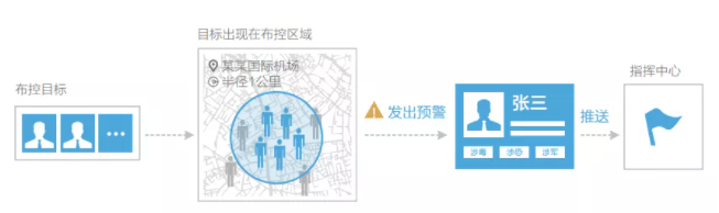 利用地图的可视化特性,快速在地图上划定区域,通过对全维度轨迹数据的实时分析,实现特定目标群体在指定区域内实时触网预警。