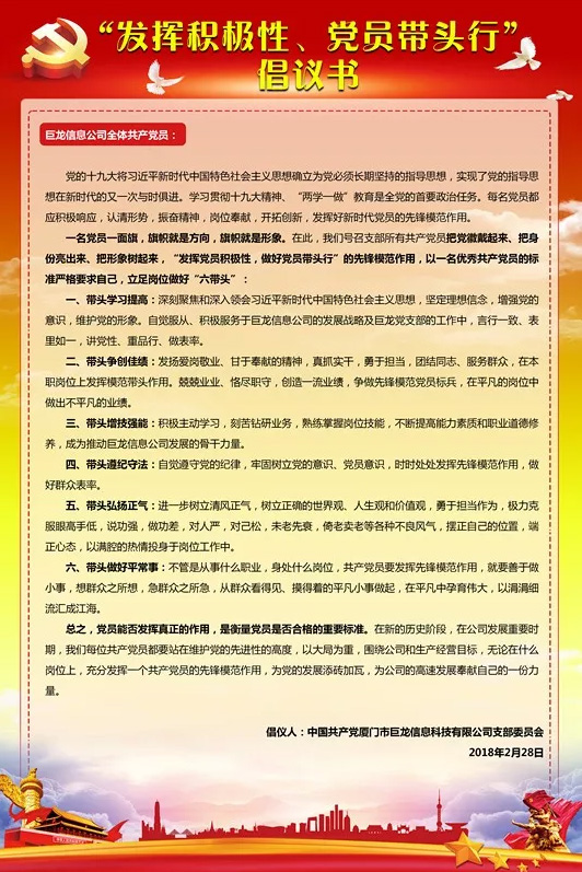 一名党员一面旗,旗帜就是方向,旗帜就是形象。2018年巨龙信息党支部号召支部发布倡议书,要求公司所有共产党员把党徽戴起来、把身份亮出来、把形象树起来,“发挥党员积极性,做好党员带头行”的先锋模范作用,以一名优秀共产党员的标准严格要求自己,立足岗位做好“六带头”:带头学习提高、带头争创佳绩、带头增技强能、带头遵纪守法、带头弘扬正气、带头做好平常事。