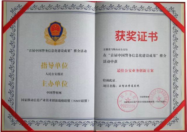 2018年5月,法度智能笔录作为云智办案通的重要组成部分助力马鞍山市公安局云智办案通系统获得人民公安报和中国警察网联合举办“首届中国警务信息化建设成果”推荐活动中获“最佳公安业务创新方案”奖。
