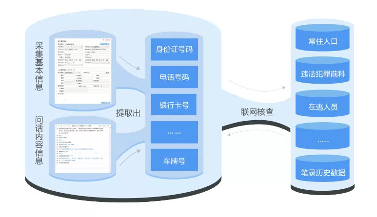笔录中的关键信息与常口库、重点人员库、笔录历史记录等;资源自动核查可快速确定重点人员信息,实现案件的串并。