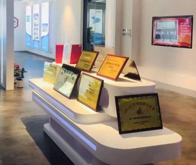 首先看到的便是公共展厅,这里采用了从企业属性中提炼“数据”这一要素作为设计元素,蓝、白、红三色搭配,色彩明亮,同时科技感十足,空间不大,但却充分利用,采用灯箱展墙、实物陈列、多媒体展示相结合的方式,立体、生动、全面地展示了我司的发展情况、业务能力、公司荣誉和企业文化。