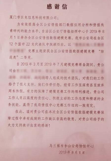 日前,巨龙信息收到了来自内蒙古乌兰察布市公安局的感谢信。信中对巨龙信息在内蒙古全区公安情报数据建模竞赛中,对乌兰察布市公安局所提供的支持与保障表示了肯定与表扬。