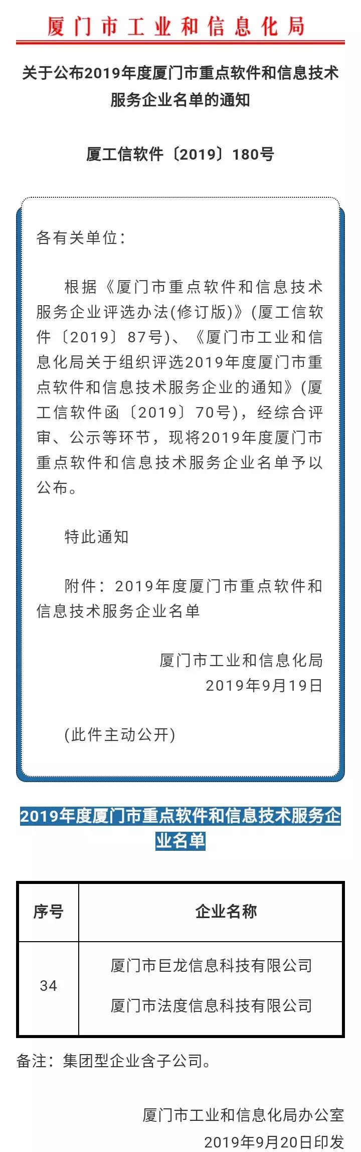 作为集团型企业含子公司,厦门市巨龙信息科技有限公司与旗下子公司厦门市法度信息科技有限公司成功入选名单。