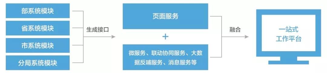 实现将部、省、市、分局业务系统的功能模块打散再组装。解决业务系统分散、数量众多,频繁切换系统和功能模块的问题。