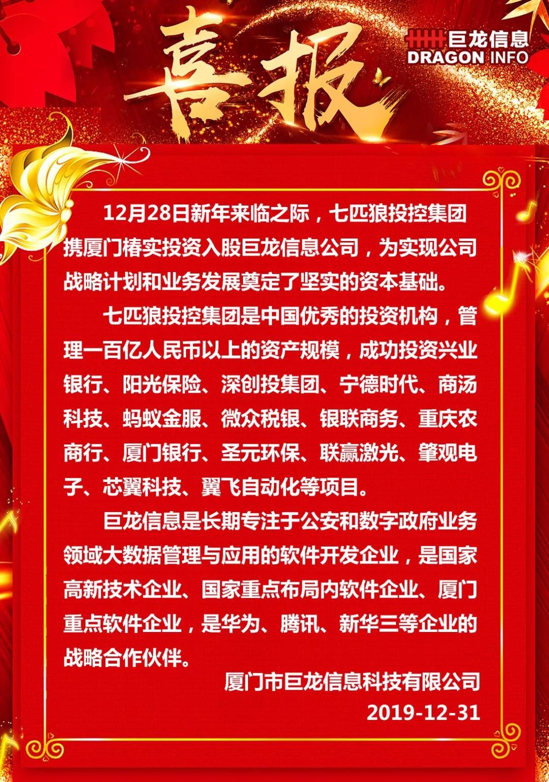 2019年12月28日新年来临之际,七匹狼投控集团携厦门椿实投资入股巨龙信息公司,为实现公司战略计划和业务发展奠定了坚实的资本基础。