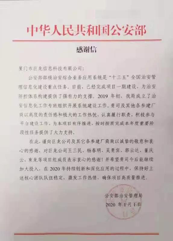 2019刚成为历史,迎着2020年的第一缕阳光,巨龙信息就收到了来自公安部治安管理局的一封感谢信。