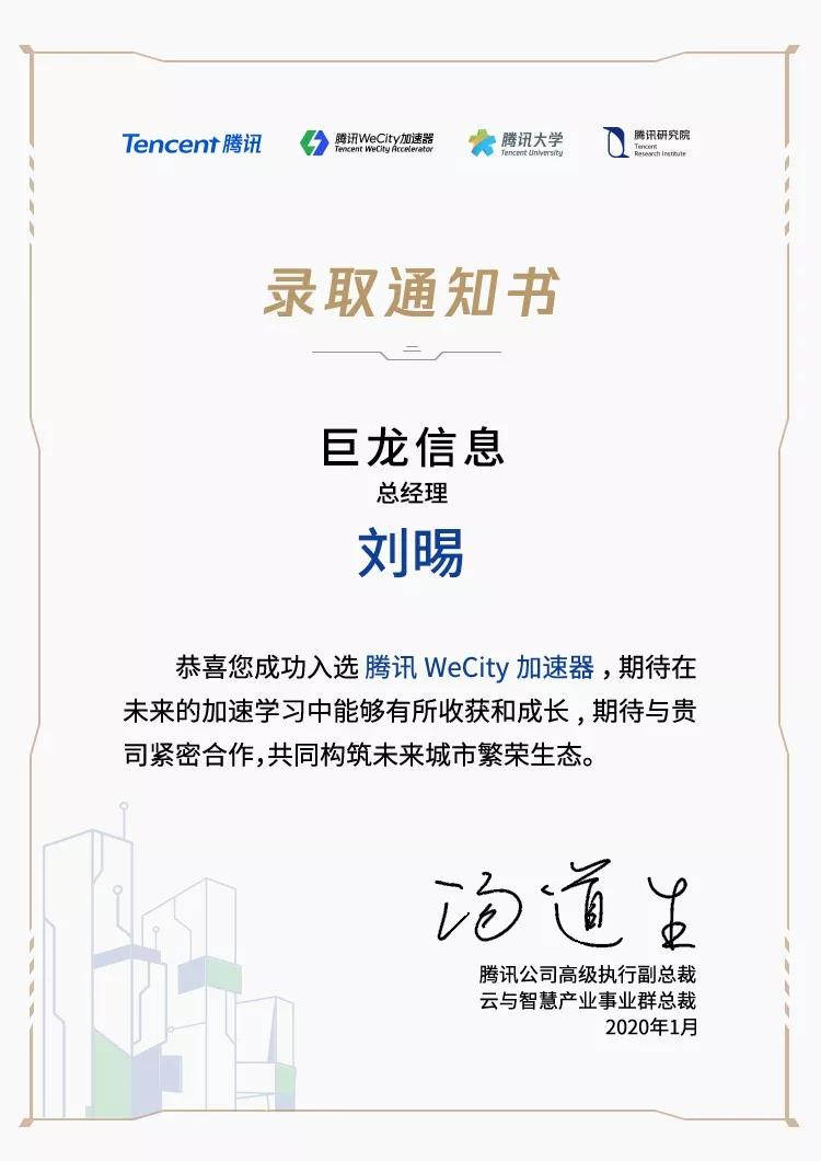 2020年1月17日,腾讯WeCity加速器正式公布入选名单,35家企业从1200个报名项目中脱颖而出,录取率仅为2.9%,总估值超3300亿元。巨龙信息成功入选腾讯WeCity加速器首期名单。