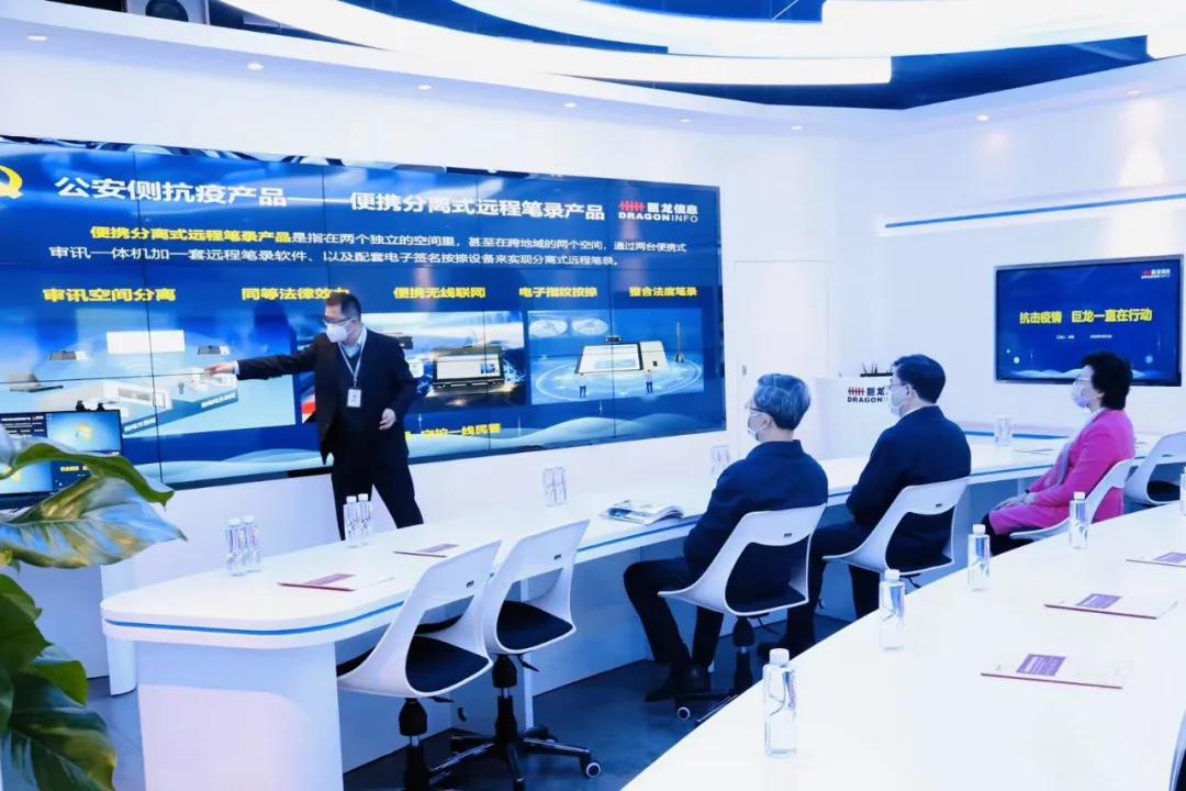 胡书记和庄市长对巨龙信息在疫情关键时刻的及时应变能力表示肯定,并对公司积极投入科技抗疫、有序复工复产给予高度赞许。同时称赞我司为三高(高成长、高技术、高附加值)企业安全、有序、规范复工的榜样,鼓励全体员工复产复工要坚定信心,积极配合各级政府要求,严格执行各项防疫规定,科学合理安排工作,做到防疫、工作两不误。