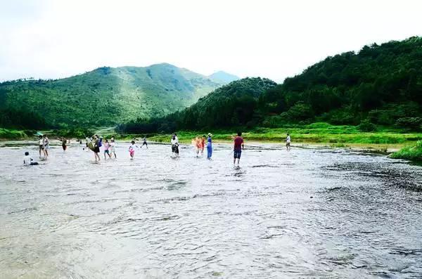 午餐后稍作休息,我们再次驱车前往仙水洋基地。这里石面平滑如砥,静无砂砾;岩石河床上布水均匀,水深仅没过脚踝,清水在阳光照耀下,波光潋滟,虽是炎炎夏日,在这里却非常清凉,真是避暑圣地,大伙卸下身上的包袱,带上拨水工具,纷纷下水咯。