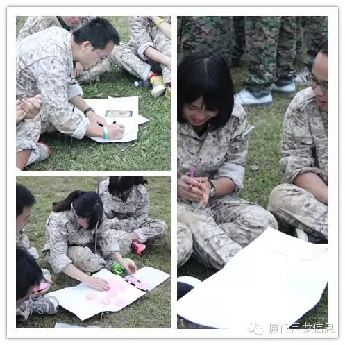 参训的所有员工们被分成了12个小组,既然是团队,就要让大家认识自己的团队。首先,我们的第一个任务就是“团队风采展示”。教官要求在五分钟内,各队就要绘制出本队的Logo及制定本队的队呼、队歌,这是一项考验队友之间的信任与协调并快速做出决定的项目。各队的展示过后,原本沉闷的气氛渐渐消失,大家显得不在那么拘束。