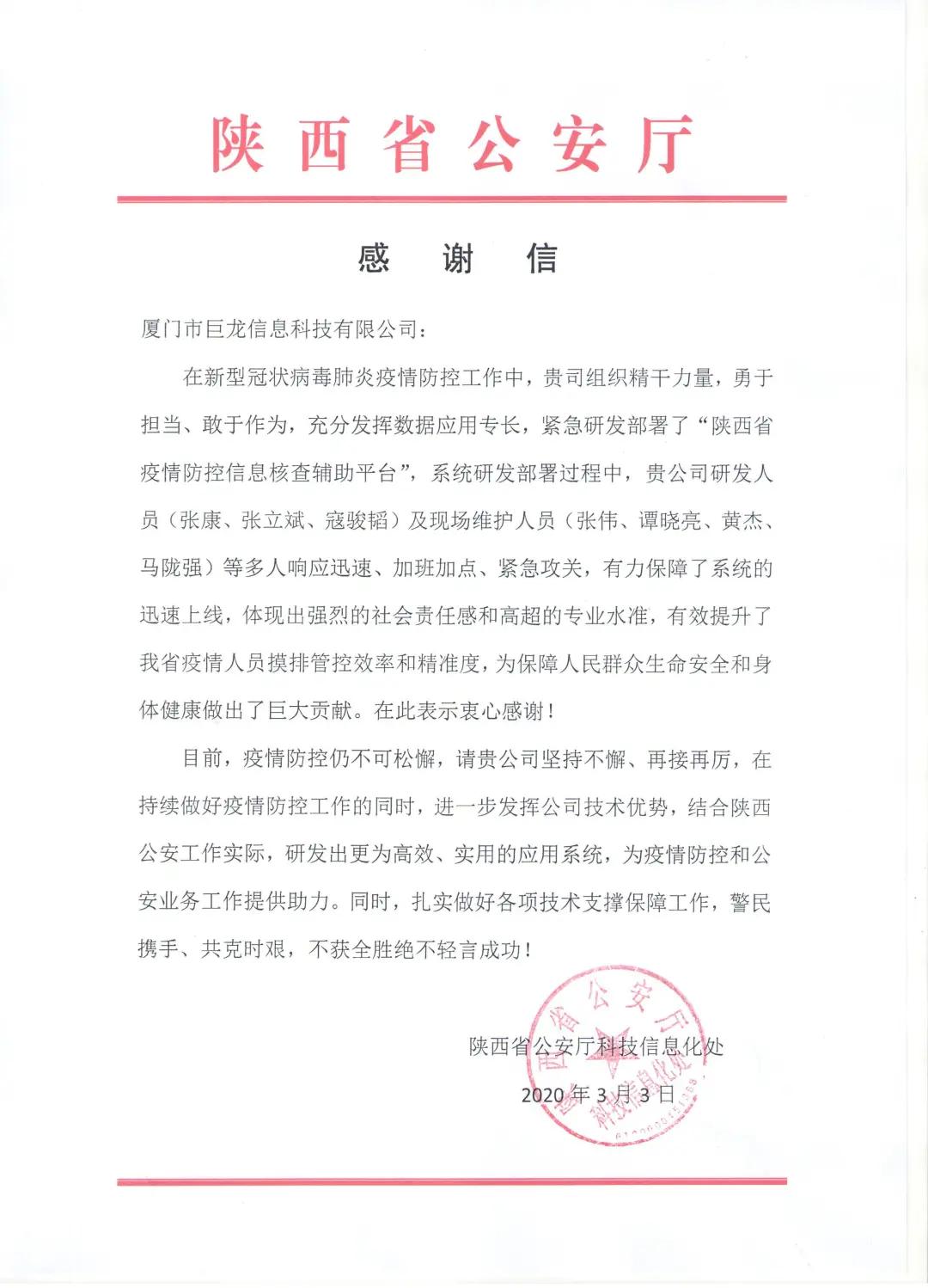 在疫情防控行动中,巨龙信息将坚实履行企业社会责任,发挥专业技术优势,通过科技手段快速服务实战,与公安用户共同守护人民平安,坚决打赢疫情防控人民战争、总体战、阻击战!