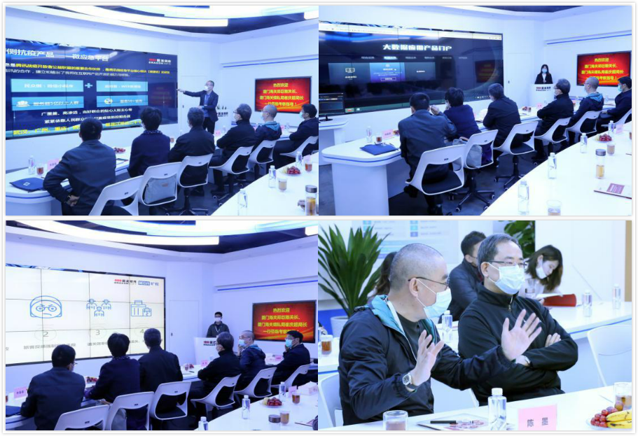 随后领导们来到业务指挥舱内,听取业务专家详细介绍公司抗疫应急应用产品、大数据应用产品、海关监察笔录产品、海关智慧审讯应用、海关缉私笔录APP、无感通关等产品。这些产品通过大数据技术整合通关、查验、稽查等业务环节数据,对碎片化的业务数据进行聚合分析,并提供对管理对象的数据分析,协同治理,实现从单向垂直管理向多元综合治理的思路。