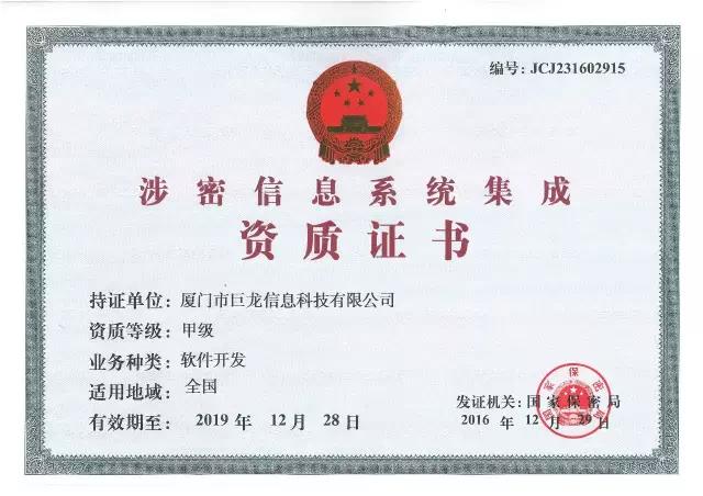 厦门市巨龙信息科技有限公司通过国家涉密信息系统集成甲级资质资格审查,并于2016年12月28日获得由国家保密局颁发的涉密信息系统系统集成甲级资质证书。