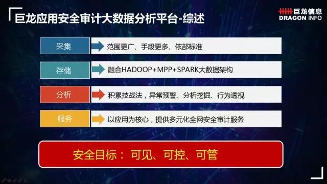 巨龙应用安全审计大数据平台,运用大数据技术手段实现数据存储和数据分析,累积分析模型,为公安各警种提供安全审计分析服务,有效防范因数据盗取、越权访问等行为造成的敏感信息泄露、侵犯公民隐私的违法违纪行为。
