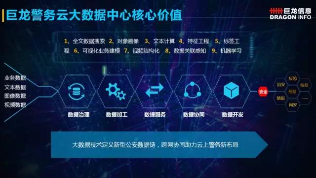 巨龙警务云大数据平台主要解决公安行业的数据治理和数据应用难题,深化警务信息资源的综合开发,建立跨警种、跨网络、跨地域的全网一体化应用,从而带动警务工作的创新发展。