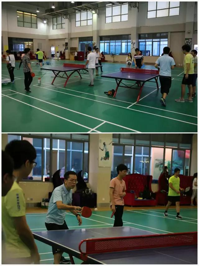 乒乓球场地运动员手握乒乓拍,身轻矫如燕,展示了公司职工能静能动,能文能武的才能。