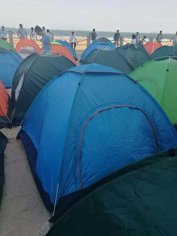 夜晚,大家共同协助在广阔柔软的沙滩上搭好帐篷,以天为被以沙为床结束了这一天的狂欢...